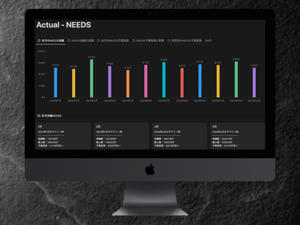2. 実績を記録: 「🌙 Actual」で日々の収入・支出・貯蓄を入力。